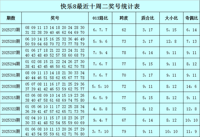 福彩好意思瞻念8第2025336期(上周二)开奖精采:01 06 08 10 11 13 20 26 27 29 41 43 54 55 59 61 62 71 76 80,其中奖号012路比为3:7:10,跨度为79,质合比为9:11,大小比为10:10,奇偶比为11:9。
