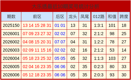 上期大乐透的开奖号码中,和值为93,跨度为30,012路比为2:0:3。